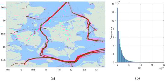 Identified collision risk over sample data from area 1 for a year: (a) Spatial distribution; (b) Risk distribution.