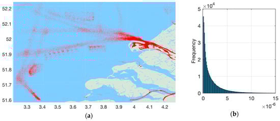 Given the one-year AIS data for the two sample areas described in Table 1, results of all the identified risky situations are demonstrated in Figure 9, Figure 10 and Figure 11. Figure 9a and Figure 10a describe the spatial locations of the identified vessel to vessel collision risks for two different areas and their respective risk distributions are demonstrated in Figure 9b and Figure 10b. Variations of both collision and grounding risk over the two areas are both shown in Figure 11 for the year 2018.