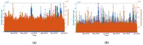 Variation over time of overall collision and grounding risk: (a) Sample data of area 1; (b) Sample data of area 2.