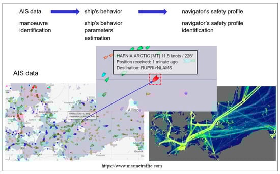 Expert tests of navigators’ profiles were made in, e.g., [,]. The tests, conducted using questionnaires, were done by employed professionals. Their task was to determine the types of navigators’ behavior at sea. Altogether, 13 types of behavior were distinguished, the most frequent were: professional (15.3%), decisive (15.3%), risk-takers (14%), careful (13.9%) and very careful (11.1%). The navigators were also asked to declare, in their opinions, safe passing distances of ships in an encounter situation. A relation was observed between navigator-declared profiles and passing distances of ships on opposite courses these navigators found safe. It was assumed that the passing distance reached was only one of the criteria describing the navigator’s safety profile. The navigator’s safety profile identification may be a valuable hint for posting a sharp lookout directed on ships that may be a potential risk. For this to be possible, the data from which the navigator’s profile is identified should be available outside the examined ship. An example of this is data available in the automatic identification system (AIS) system. This was a prerequisite for starting research into the possibility of identifying the navigator’s safety profile of both own and other ships on the basis of recorded AIS data []. The general concept of navigator’s profile identification is shown in Figure 1.