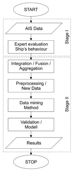 The navigator’s profile identification process consisted of two stages (Figure 2). In the first stage, simulation tests of navigators’ behavior in collision situations were conducted (AIS data). That stage consisted of preliminary processing and visualization of recorded data, used for assessment of ships’ behavior by experts. The data thus obtained were used in the second stage of creating a model (classifier) of the navigator’s profile identification. Statistical and artificial intelligence methods were used for integration, fusion and aggregation of data, pre-processing and identification and validation of the model.