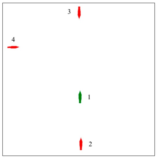 - Encounter of two ships, initial course 045°—“Crossing”, maneuvering ship does not have the right of way (Figure 3, ship 4).