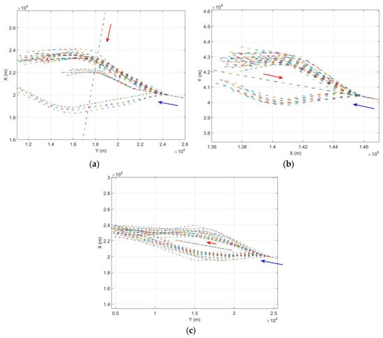 The first step to the analysis and calculations for all scenarios was to determine the true trajectories of the ships. This was helpful in a preliminary visual assessment of the data. The real trajectories in one scenario 045° are depicted in Figure 4, where red and blue arrows show movement directions for non-maneuvering and maneuvering ships respectively.