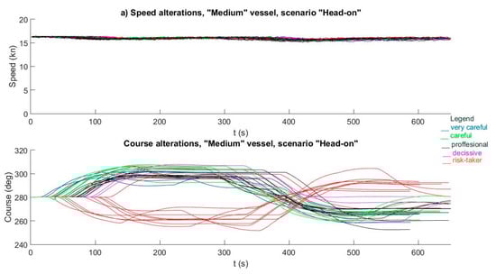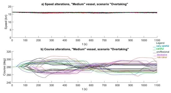 Overtaking maneuvers were executed on either side of the ship being overtaken. All the actions were correct. The moment of starting the maneuver was varied, and most of the test participants performed two course maneuvers till the other ship was overtaken (Figure 7). No speed maneuvers were observed (low speed changes visible in the charts are the side effect of a large and intensive course alteration).