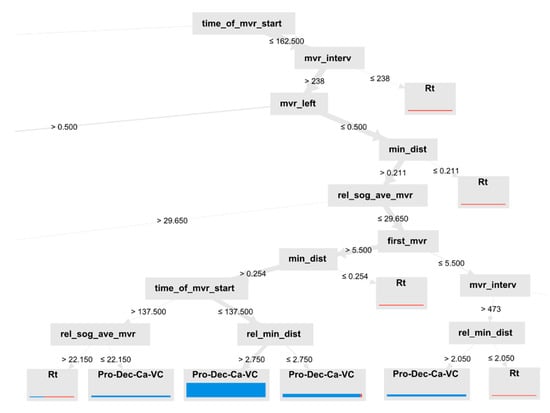 The method of navigator’s profile identification herein presented makes use of data classification by the decision tree. In the example considered, the maximum depth of the tree has 10 levels, and both prepruning and pruning were not used. The set of all attributes made up input data to the model. The “Gini index” [] strategy was taken as a criterion for dividing attributes into classes. An evolutionary algorithm was used for the optimization of the set of attributes. This model generated a decision tree for the identification of the navigator profile. The profile identification consisted in data classification into two decision classes—safe profile (Pro-Dec-Ca-VC) and risk-taker profile (Rt). The outcome of data classification after 10-fold cross validation is presented in Table 4 and Figure 8.