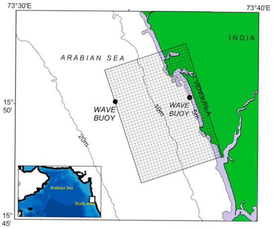Study area in the eastern Arabian Sea showing the locations of the wave rider buoys at 15 and 5 m water depth. The rectangular box represents the model grid and its boundaries.
