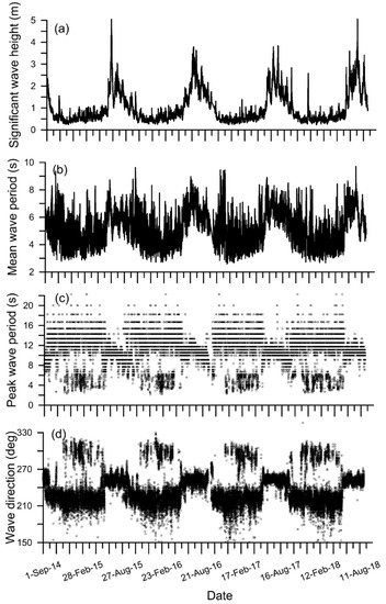 Time series plot of (a) significant wave height, (b) mean wave period, (c) peak wave period and (d) mean wave direction from 1 September 2014 to 31 August 2018 at 15 m water depth.