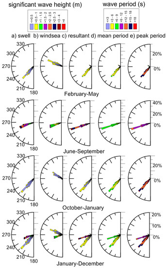 Wave rose diagram for significant wave height of (a) swell, (b) wind-sea and (c) resultant. The right panel is for (d) mean wave period and (e) peak wave period in different seasons from 1 September 2014 to 31 August 2018 at 15 m water depth.