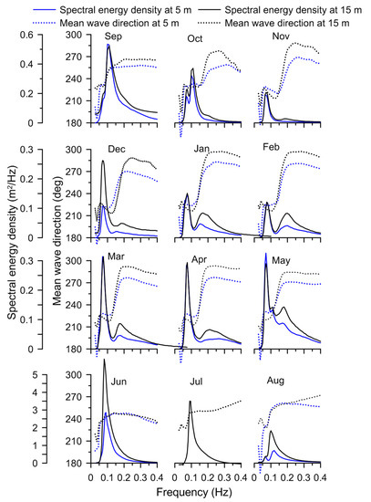 Monthly averaged wave spectrum showing the variation of spectral energy density and mean wave direction at both 15 and 5 m water depth.