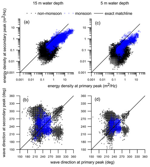 Top panel shows the scatter plot of spectral energy density at secondary peak with primary peak. Bottom panel shows the scatter plot of the wave direction at primary peak and secondary peak. The wave data from September 2014 to August 2015 at 15 m water depth is presented in (a,b) and that at 5 m water depth in (c,d).