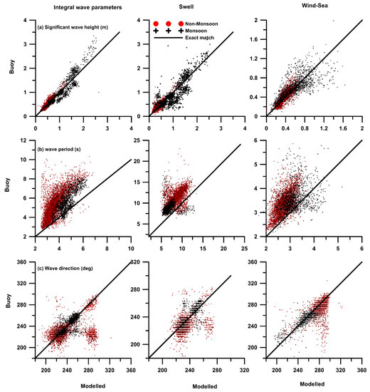 Scatter plot of (a) significant wave height, (b) mean wave period and (c) mean wave direction for integral wave parameters, swell and wind-sea between measured buoy data at 5 m water depth and that based on wave model.