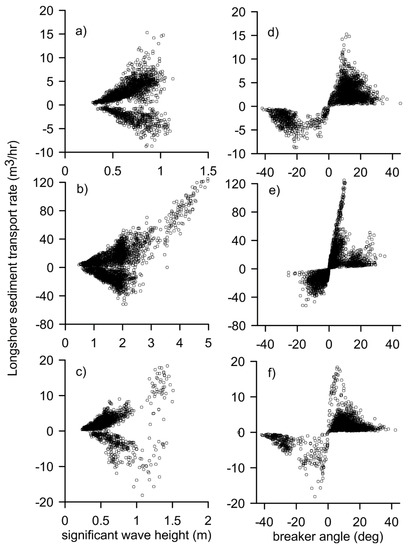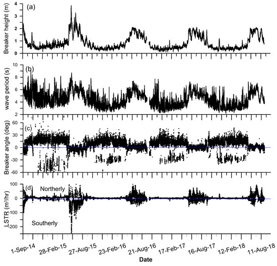 Variation of LSTR with the Hs indicates that the LST increases with an increase in the wave height and decreases with the reduction of wave height (Figure 8). LST rates are influenced mainly by the breaker parameters [14]. The influence of breaker height on LSTR for different seasons is studied through a scatter plot between these two parameters during the annual cycle 2014–2015 (Figure 8). The breaker height is high during the monsoon and is in the order of 1 to 2 m; the LSTR is also high during this season. Wave breaker angle is low during the monsoon, whereas the sediment transport is high during this time (Figure 8). Noujas et al. [27] examined the sensitivity analysis of net LSTR by increasing the wave height contribution by 10% and observed an increasing trend in LSTR. Recently, Jesbin et al. [26] investigated the influence on variations in LSTR due to errors in breaking angle and breaker height and observed that they are sensitive to LST rates and could lead to large errors in their estimation. There is a high variability of LSTR during the monsoon season. The annual gross LST for 5%, 10%, 15% and 20% increases in the Hs values are 71,933, 78,961, 86,427 and 94,322 m3/yr. A 5%, 10%, 15% and 20% increases in the Hs value results in 10%, 21%, 32% and 44% increases in the annual LST. Even though the waves are influenced by the sea breeze during the pre-monsoon period, the influence of sea breeze on LST is negligible (figure not shown) since the LST depends on both the wave height and wave period and these two parameters have an inverse relationship during the sea breeze period [49,53].
