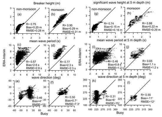 (a–f) Scatter plot between the breaker parameters from buoy-measured data and ERA-Interim data. (g–l) Scatter plot between buoy-measured data and ERA-Interim data at 5 m water depth.