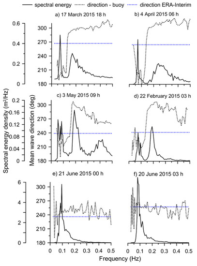 The large difference in the LSTR between the two estimations is due to the large difference in the wave period and wave direction between the two datasets (Figure 9). Breaker height from ERA-Interim Hs can be estimated with an RMSE of 0.29 m for the study area, but the wave direction shows large scatter (up to 17°) (Figure 9). Even a 20% increase in the Hs value results in a 44% increase in the annual LST [24]. An earlier study [59] showed that the ERA-Interim wave period is close to the energy wave period (Te = m-1/m0) and not the mean wave period of the buoy data and hence, there is large scatter between the mean wave period of the buoy-measured data and the ERA-Interim data (Figure 9). The large difference in the wave direction is due to the fact that ERA-Interim data is based on a low-resolution global model (0.70° for the atmospheric model and 1° for the ocean model [43]) and also the measurements are made in the nearshore environment. Another reason for the substantial difference between the wave direction of the ERA-Interim and the buoy data is due to the predominance of wind-seas and swells in the study area. During the non-monsoon period, in some of the instances, the spectral energy of the wind-sea peak and the swell peak have comparable energy, and during this period, the direction of the wind-sea and swell have a large difference (Figure 5). In some cases, the ERA-Interim data shows the swell direction, whereas the measured data represent the wind-sea direction, whereas, in other instances, vice versa is observed (Figure 10). Also, the short-term sub-synoptic scale wind pulses and fluctuations are not likely to be captured by a lower resolution ERA-Interim data [42,59]. Hence, datasets like ERA-Interim cannot be solely used for studying the nearshore processes, especially for estimating the LSTR without validation.