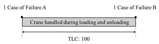 MMBF is defined as a twist lock count (TLC, Unit: VAN) divided by failure maintenance case. If this is interpreted, the crane corresponding to the denominator shall be marked with one physical failure when crane operation is stopped due to a partial defect in the crane itself and maintenance is required. The operating conditions of the TLC corresponding to the numerator are three steps to fulfill. The first step is forward or backward operation of the trolley, the second step is up or down operation of the hoist, and the third step is the lock or unlock operation of twist lock pins. MMBF is a numerical representation of how many containers the crane handled during loading and unloading operations, for instance, between one failure of "A" and one failure of "B". Figure 2 shows and example where this is expressed numerically.