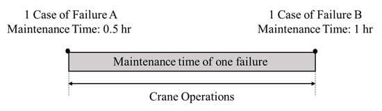 MTTR is defined as total time for emergency maintenance divided by the failure maintenance cases. If this is interpreted, the crane corresponding to the denominator is marked with one failure when its operation is stopped due to a component defect in the crane itself and maintenance is required. The total time for emergency maintenance, which corresponds to a numerator, is defined as the time from the start time when the crane is stopped during operation to the time when the crane is put back into work immediately after the repair is completed. MTTR can be expressed numerically as shown in Figure 3, if the crane has a maintenance time of one failure, e.g., A and maintenance time of one failure of B, during loading and unloading operations of a crane.