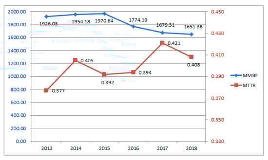 Table 2 shows that man-hours and cases in the mechanical and electrical sectors are the smallest in 2013, and the man-hour and cases in the mechanical and electrical sectors are the highest in 2017 like those of MMBF and MTTR. This man-hour value indicates all cases involving both preventive and emergency maintenance. Something interesting is that the performance indicators in Table 1 and man-hours show a similar trend. Looking at Table 1 and Table 2 above, it can be seen that the number of MMBFs is decreasing due to the continuous increase in the volume of containers handled at the terminal and the increase in fatigue of crane structures due to accumulation of long-lasting heavy load operations, whereas the number of machine part maintenance events and man-hours are steadily increasing The results of MMBF, MTTR, emergency maintenance, and preventive maintenance indicate a predictable correlation. A lower preventive maintenance rate would increase emergency maintenance and also see a decrease in the number of MMBF. Figure 5 shows that MTTR is also reduced at the same time that the failure rate is reduced. It can be seen that MMBF increases proportionally if preventive maintenance of the equipment is thoroughly carried out. The results are aggregated to maintain good maintenance rate of equipment by increasing MMBF of equipment according to the flow of emergency maintenance rates, and it is also possible to assume that equipment cannot undergo the proper preventive maintenance normally when there is more volume increase in the container terminals. Periodic preventive maintenance shall be performed to manage the maintenance of the equipment beyond the target, and a prompt response shall be made in the event of unexpected failure or equipment failure during vessel operation. Man-hours is one of the performance indicators used throughout all industries that existed before the creation of MMBF and MTTR. An engineering department in a container terminal can calculate man-hours based on statistics and provide reference values for switching to outside processed tasks when there is an insufficient man-hour figure for performing work with the current man-hour reserves for future projects or construction.