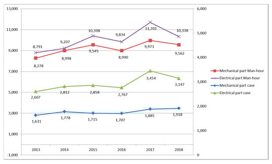 Man-hours has been always the oldest and major standard through the whole industry to be visualized in numbers to plan a budget for the future and dispatch the appropriate amount of human resources to fulfill tasks that we need in the right spot and the parts designated to be repaired. These are the result values of man-hour and case spent on mechanical and electric parts of STS cranes from 2013 to 2018: