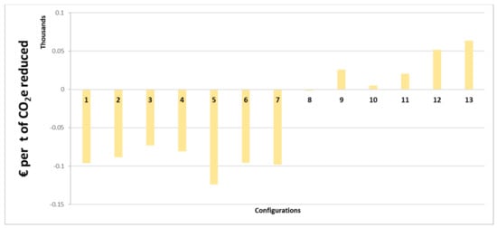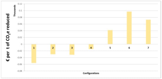 The cost-benefit analysis results for the investigated configurations are displayed in Figure 7. The results of the cost-benefit analysis in addition to the results from Table 16 indicated that solution 1 had the lowest carbon emissions and the highest life cycle cost. This solution had the lowest carbon emissions according to Table 16, and since the ratio was negative, it could be inferred that the life cycle cost of the solution was higher than the baseline. Therefore, according to the figure, it was evident that it had the highest cost for the emissions reduced. On the other hand, the solutions 5, 6 and 7 had a positive ration due to the fact that the life cycle cost of the solutions was lower than the baseline, due to the lower price of the natural gas.