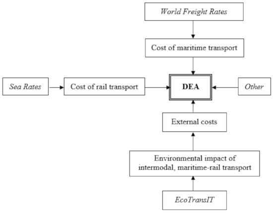 The research is also limited by the performances of EcoTransIT software: the more advanced the program, the more objective the results will be. The model does not need to use this software, but it allows for easier handling. Uncertainties are common on the transportation route. Failures, weather conditions, traffic congestion, unloading/reloading times, accidents, etc., happen and often are not predictable. Even if they are, they usually cannot be avoided. Uncertainties burden all traffic routes, but some of them can temporarily be burdened more, which the authors or logistic providers may not always know. The transport time variable is uncertain, and sometimes does not correlate with the distance variable. EcoTransIT cannot count on uncertainties. For reasons of uncertainties, the assumption was introduced in the conditions of the research that the quality of transport service is approximately equal on all transport routes. In the DEA settings, the transport time variable is marked as an uncontrolled one and, thus, less burdensome on the other variables encountered in the method.