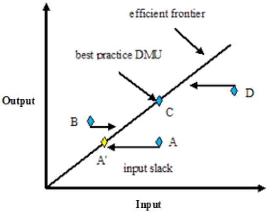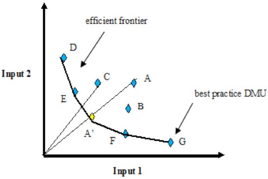 In the schematic view of the simplified variant, the DEA efficiency frontier is a line and the point at the line represents the decision-making unit (DMU) of maximal efficiency. All other DMUs moved away from the line are inefficient. In the input-oriented model, the DMU inputs should be corrected to become efficient, and their horizontal distance off the line represents the size of correction required (input slack). In the two-input and single-output variant, the efficiency frontier is a curve, and inefficient DMUs require correction, which is measured as the DMU point distance off the curve () at the line passing through the DMU point and the zero point (Figure 3). In this example, both inputs should be reduced.