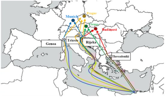 Optimal routes towards central European destinations, selected within the proposed research model by DEA, are shown in Figure 4.
