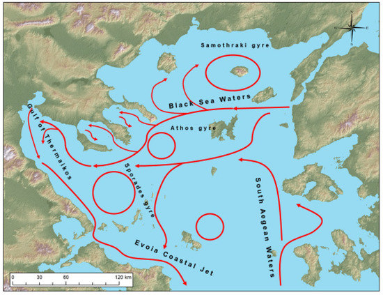 The low salinity and cold waters from the Black Sea influence the Northern Aegean Basin circulation, and they are the main reason they distinguish the Northern from Southern Aegean basin. The Black Sea waters, after entering the Aegean, they are divided into two main masses, the first flows to the North towards the Sea of Thrace and the second flows southern, towards the Sporades islands and then reaches the Southern Aegean through the Kafireas and Mykonos-Ikaria straits [25]. Two major anti-cyclonic formations are present at Limnos and Samothraki islands and a smaller one western of Thasos Island [26]. Another cyclonic formation can be observed at the Sporades archipelagos, which changes seasonally to an anti-cyclonic one. The flow from this formation continues to the South, along the Eastern Coastline of Evoia island, creating a strong and narrow coastal current.