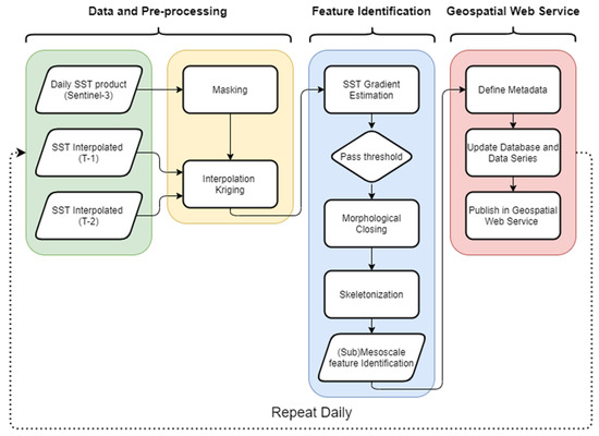 A fully operational service is presented to produce daily mesoscale and sub mesoscale oceanic feature localization maps. The service has three main sections: (a) obtaining the raw satellite data and pre-processing them in order to be used for the detection algorithm; (b) the detection process that produces the maps for the end users; and (c) the implementation of the geospatial web service, that publishes the end results according to the OGC standards (Figure 2).