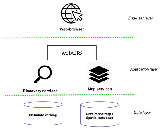 Generalized visualized architecture of an SDI. It integrates the Data layer, that consists of the infrastructure for storing data and metadata, Application layer, where the processing takes place and acts a medium between the user and the data, and End-user layer, the interface for interacting with the application layer and visualizing information.