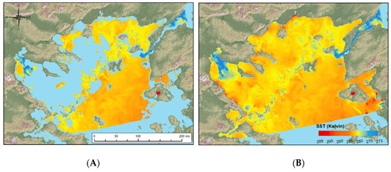 In an effort to investigate the fluctuations of SST, a number of remotely sensed data were used over a number of timespans for the study area. Primary data include unwanted objects such as cloud coverage and land surface cells, which are not relevant to our research question. Thus, there is the need to remove (a) cloud coverage cells and (b) land surface cells as well as (c) extreme values near the coastal areas. The latter are considered to be data “noise” because of the anthropocentric activities nearby, the river outflows and the possibility of low bathymetry. A 5 km buffer zone around coastlines has been excluded. Cloud and land pixels are removed with a masking approach.