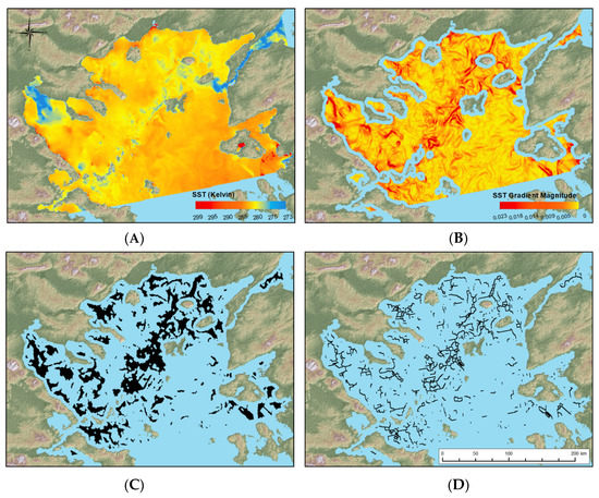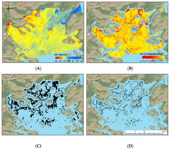 The skeletonized data simplify the visualization of the resulting thermal fronts, but they introduce additional noise (Figure 5D and Figure 6D). Especially in more complex objects, the thinning procedure tries to capture the general shape as well as the uneven extensions of them resulting, in many cases, in convoluted lines. Moreover, this technique further degrades the fragmented features and their identification without prior knowledge of the general circulation of the Northern Aegean is harder. For that reason, an overlay of the skeletonized data on either the original interpolated SST image or the gradient magnitude would be more useful for the average user to make photo-interpretation decisions. Especially the gradient magnitude products provide continuous information on steep SST changes indicating the position of both strong and weak circulation formations used in conjunction with the skeletonized data, users can track the fronts’ position and where they are fragmented, the underlaid information can help them visualize these gaps.