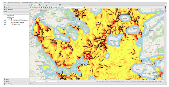 In Figure 7, a preview is presented of the webGIS application interface. At the top toolbar, users can alternate between data viewing and file reading, as well as gain access to the user manual. The left panel is responsible for manipulating the visualized data information. All available layers can be selected or unselected, depending on whether they should be included in the map, from the left panel. In addition, the legend tab shows the scalebar of raster data and the feature labels, and the selected tab prints information on chosen areas, pixels and features. Directly above the interactive map, there are tools available for navigation, measuring and basic processing as well as printing the visible layers for rapid data retrieval. From the Search Results (down below), the query results are printed, and option is given for scrolling between different dates for visualizing the respective data automatically in the interactive map.