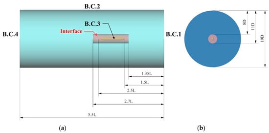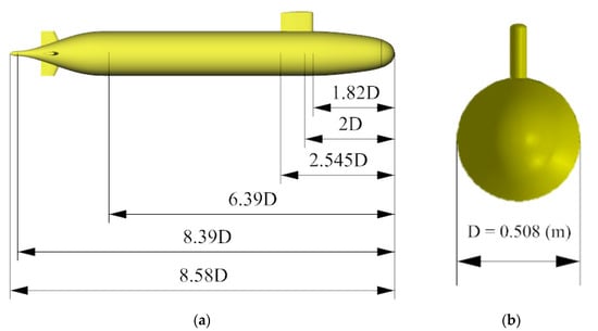 According to [], the computational domain was designed to be a cylinder flow field. It is ensured that the length of the flow field was appropriate for capturing flow field characteristics, such as the following wake effect behind the submerged body at any speed. The length of the numerical flow field was set at 23.96 m (approximately 5.5 times the vehicle’s length, 5.5L). Moonesun, et al. [] indicated that the width and height of the flow field can be set approximately seven times the vehicle’s diameter (7D) for the CFD modeling of the submerged body. In other words, provided that the height and width of the flow field were both set at 19 times the model’s diameter (19D), the simulation results of the numerical flow field would be further guaranteed to be free from the influence of the computational domain boundary. More details of the computational domain can be illustrated in Figure 3.