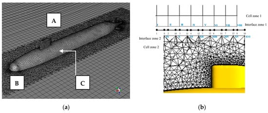 According to [], the multi-zone method can automatically decompose the geometric model into blocks, generate a structured hexahedral mesh in the area suitable for dividing the hexahedral mesh, and in other areas generate unstructured tetrahedral meshes. In Figure 4a, there are three regions in the computational domain []: one is the interior region (region B) that surrounds the unstructured tetrahedral meshes of the object (region C) without relative motion with the object, the other one is the exterior region (region A) that excludes the computational domain around SUBOFF. More details of mesh properties can be introduced in Table 2. Furthermore, Figure 4b shows the interface between region A and region B. In the schematic diagram, two regions of cells meet at the non-conformal interface. Specifically, fluxes across the grid interface would be calculated using the faces resulting from the intersection of the two interface zones, e.g., faces 9-2 and 2-10, instead of the interface zone faces, e.g., face IX-X themselves.