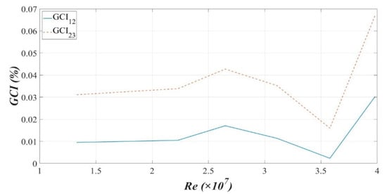 In Figure 5, GCI12 represents the analysis results of = 2.66 and 2.22, and GCI23 represents the analysis results of = 2.22 and 1.85. The corresponding Courant–Friedrichs–Lewy conditions were presented in Table 4. It is obvious that the GCI values decrease accompanied by successive grid refinement for a given number. On the other hand, the variation of the time step appears to have little influence on the GCI curve with the increase of the Reynolds number. However, the results at high Reynolds numbers are slightly inconsistent with the ones at low Reynolds numbers. It is due to the fact that the SST k-ω turbulence model may produce a bit too large turbulence levels in regions with large normal strain, like stagnation regions and regions with strong acceleration, especially at a high Reynolds number. Since all GCI values are below 0.07%, it is verified that the dependency of numerical results on the grid size has been reduced and the solution achieves the grid-independent solution.