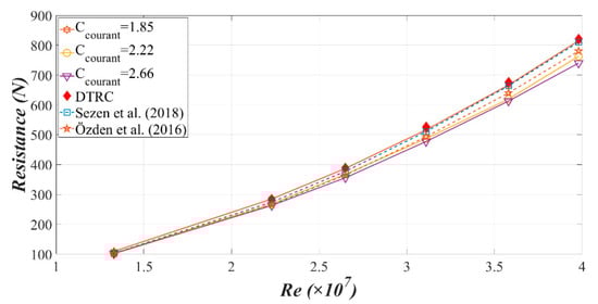 Comparisons of simulation results () of the resistance with David Taylor Research Centre (DTRC) experimental data and the published numerical results of [,] under different Reynolds numbers.