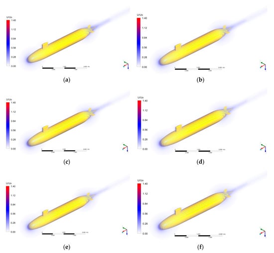 Figure 8a–f present the normalized velocity contours around the SUBOFF model under different towing speeds. In order to highlight the flow variation around the SUBOFF model, the velocity contours have been normalized as U/U0, where U is the flow velocity relative to the towing velocity U0. It is found that the boundary layer develops from the stagnation point. Subsequently, the boundary layer and the upstream flow interact with the leading edge of the sail, which causes a local velocity gradient in front of the sail. The adverse velocity gradient occurs near the stern due to the contraction of the hull shape and contributes to the flow separation of the boundary layer. When the boundary layer flow from the hull interacts with the rudders, it causes rapid rises of local velocities in front of the rudders. Eventually, the shear layers shed from the hull and the rudders are propagated downstream into the wakes. Moreover, the extent of radiation to the surroundings also increased as the towing speed increased.