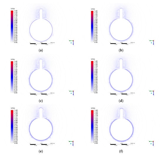 The normalized velocity contours around the cross-section of the rudder at x/L = 0.896 of the SUBOFF model under towing speeds of (a) 3.05 m/s; (b) 5.144 m/s; (c) 6.096 m/s; (d) 7.16 m/s; (e) 8.23 m/s; and (f) 9.151 m/s at t = 30 s.