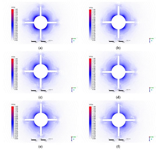 A detailed observation of the normalized velocity contours around the rudders at x/L = 0.896 of the SUBOFF model under different speeds has been illustrated in Figure 11a–f. Due to the boundary layer interacting with the rudders, the hole in the center of each wake profile is generated. It is found that the wake pattern for each case is very similar, with a reduced axial velocity around the rudders. Such non-uniform flow may cause notable noise when it meets the propeller. Therefore, propeller designers must consider the wake distribution at the stern rather than evaluating its performance solely on the basis of propeller properties.