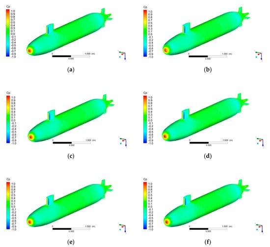 In addition to velocity distribution in the flow field, the pressure distribution on the submerged body is a substantial factor in the design process. Although the change of pressure caused by flow velocity change cannot be compared to the pressure generated by seawater as the submerged body dives deeper underwater, the distribution of high and low pressure on the submerged body serves as an additional reference for evaluating the shape design. Figure 12a–f present the distribution of pressure coefficients on the SUBOFF model under different speeds. The pressure coefficient is defined as , where P is dynamic pressure and is static pressure.Figure 12a–f reveal that pressure distribution around the submerged body did not change notably with the towing speed, and the areas with the highest pressure were the bow, front edge of the sail, and front edge of the stern appendage. Moreover, low-pressure areas were observed where the flow accelerated, such as the bow, sail, and stern, whereas no notable pressure changes were observed amidships.