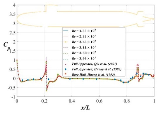 Furthermore, Figure 13 exhibits comparisons of simulated and experimental pressure coefficients along the top meridian line of the SUBOFF model with full appendages under different conditions. From the comparison of SUBOFF without appendages and full appendages in Figure 13, it can be seen that the value is related to the geometric shape, and the wavering of the value is most obvious before the position of the sail (x/L = 0.2). In front of the after body (x/L = 0.8), the value rises relatively as the hull diameter decreases and also decreases in front of the rudder. The experimental data from [] were measured at . It is obviously found that the Reynolds number has almost a tiny effect on the variation of the pressure coefficient . In general, the simulation results are almost consistent with the experimental data from []. Meanwhile, the simulation results reveal that has a maximum value at the stagnation point (x/L = 0), and then decreases rapidly before it reaches the trip wire (x/L = 0.04). In the rear of the tripwire, has a local peak at the top meridian in front of the sail (x/L = 0.21) and then has a sharp decrease. Since the wake from sail affects the pressure before x/L = 0.4, varies constantly only in the region 0.4 < x/L < 0.7. Apparently, the adverse pressure gradient occurs in the stern (0.7 < x/L < 0.88) and then reaches its local maximum in front of the rudders (x/L = 0.88). Definitely, the variation of in the stern (0.7 < x/L < 0.88) is caused by the interaction of boundary layers with the rudders.