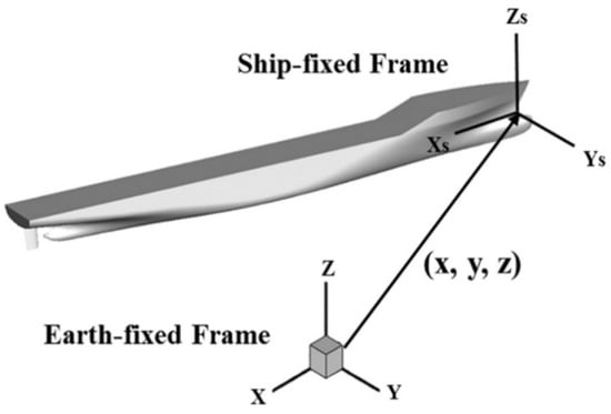 In the process of the towing simulation, the attitude (pitch and heave) of a KCS always changes with the pressure distribution on the hull surface, hence the need for the 6-DOF equations [25]. The equations involve a time item; therefore, the unsteady RANS equation was solved with the 6-DOF system integrated into the solution program. Figure 1 shows the coordinate system of the HUST-Ship program. The 6-DOF equations can be written as: