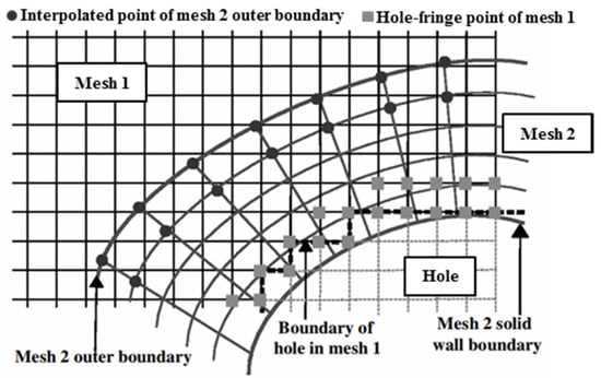 The overall flow field is usually divided into a system of grids which overset one another by one or more grid cells. As shown in Figure 2, the points of mesh 1 that fall into the solid surface of mesh 2 are marked as hole points which do not participate in the calculation of the flow field. The points adjacent to the hole points in grid 1 are hole boundary points. These points accept the flow field information transmitted from mesh 2 through interpolation. Correspondingly, the outer boundary points of mesh 2 would also receive the flow field information transmitted from mesh 1 through interpolation, which is obtained by the trilinear interpolation method. The area between the hole boundary point of mesh 1 and the interpolation point of the mesh 2 outer boundary is the overset area.