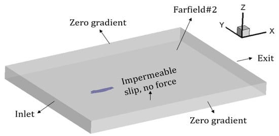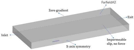 Figure 4 and Figure 5 show the computational domains and the boundary conditions of the model scale and full scale respectively. The upstream is the “Inlet” boundary condition and the downstream is the “Exit” boundary condition; the Y = 0 plane of full-scale calculations is set as the symmetrical plane boundary condition “X-axis symmetry”; the side of the tank is set as a constant velocity boundary condition “Zero gradient”; the top of the domain is a far-field boundary condition “Farfield#2”; for limited water depths, the bottom of computational domains are set as the impermeable boundary “Impermeable slip, no force”, on which the force will not be calculated by the solver, while it is usually set as a “Farfield#1” boundary condition in deep water simulations.
