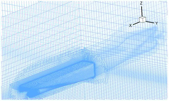 The prismatic rectangular computational domain was generated to simulate the flow around the KCS. For full-scale calculations, a larger Reynolds number resulted in the need of thinner boundary layers, which increased the number of mesh cells. Due to the symmetry of the ship geometry and the 2DOF ship motion, the hydrodynamic characteristics of the ship obtained by half of the computational domain and the whole computational domain are the same, so only half of the ship and domain were used for full-scale calculations to reduce the number of mesh cells.