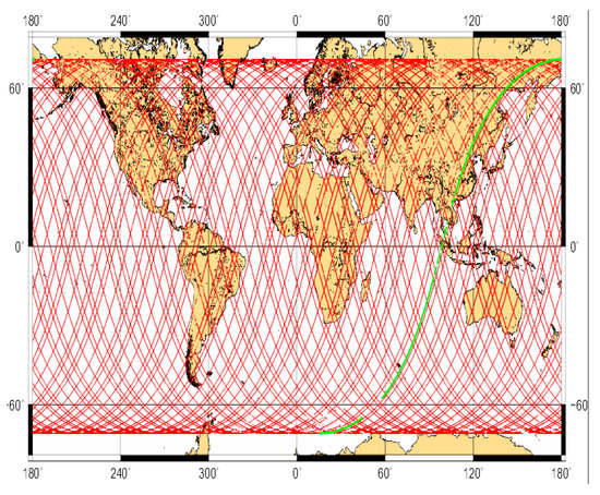 As the observed field, the values of the sea surface height (SSH) were chosen from the Archiving, Validating and Interpolation Satellite Observation (AVISO) archive. They are available on the Internet, here: www.aviso.altimetry.org (accessed on 26 September 2020). The observations were selected along the satellites’ tracks whose global scheme is presented in Figure 1 (borrowed from the site www.aviso.altimetry.org).