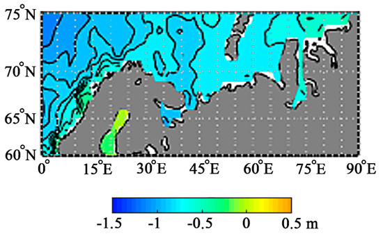 It is seen in Figure 7a that in the calculation without DA, the velocity of the main current in the west–east direction is about 0.5 m/s; it is localized from the coasts of Norway up to approximately 72°–73° north latitude in the northern direction, and further, up to the coasts of Novaya Zemlya in the eastern direction. The scheme of currents is well known qualitatively [28]; from the quantitative point of view, it is interesting to know the values of the calculated velocities of currents. It is seen from the results of calculation with assimilation of the SSH data shown in Figure 7b that the main current shifts westward up to the coasts of Scandinavia and becomes more chaotic, extending not only across the above-indicated regions, but further northward. The difference of the values of the velocities of currents themselves varies from 0.2 m/s in the regions near the coasts of Scandinavia to −0.2 m/s in the Barents Sea and in the White Sea. Thus, in the calculations with no DA, the values of the currents’ velocity are somewhat underestimated on the west and on the north of the calculation region and, on the contrary, overestimated in the Barents Sea and in the White Sea in comparison with the calculations with assimilation of the SSH data. We should especially emphasize a distinct intensification of currents along the coastline of the White Sea and the Kara Sea, namely, more than by 0.2 m/s (Figure 7b), which may be of great importance for calculations of the optimal ways of ships along the Northwest Passage.