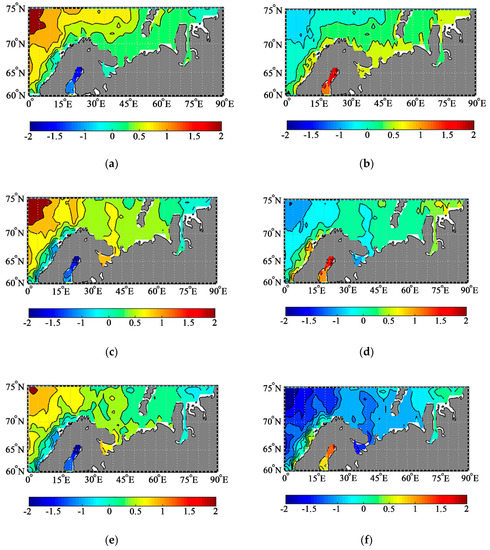 It is seen in Figure 2a that the ocean surface height rises in the north–northeast direction from −1 m to the north of 70° north latitude to 0.2 m to the east of the Gulf of Ob in the Kara Sea. The model calculation shows quite a continuous and smooth change in the SSH with no distinct kinks or vortices. With DA, the SST field becomes much more chaotic; the zone of minimum values on the northwest of the calculation domain significantly decreases and splits into several zones of local minima; vortex values emerge to the west of the Novaya Zemlya. The zone of SSH maximum of about 0.2 m becomes noticeably smaller and covers the region only to the east of the Gulf of Ob, while to the north of this region, the values of SSH decrease. On the whole, the fields of the model calculation reflect quite well the growth trend along the main currents of this region (the northern branch of the North Atlantic Current [31]). The difference between the assimilated and control values presented in Figure 2c shows the absolute value of corrections and their localization. It is seen that the corrections themselves are not large; they do not exceed 0.3 m in the maximum and have quite a complicated structure. The model noticeably underestimates the SSH to the north of the Kola Peninsula, up to 0.2 m, and to the north of the Novaya Zemlya. On the contrary, the model calculation (control) overestimates the values of the SSH in the Gulf of Ob region and in the region located on the northwest of the calculation domain. It should be noted that the structural peculiarities of the SSH field practically do not change, neither in their localization, nor in the amplitude in Figure 2a,b, which is evidence of the fact that the GKF method does not change the structure of the model fields, and that the NEMO model describes quite well the SSH fields in a large scale. However, for the difference of these fields presented in Figure 2c, the structures of a smaller scale with the amplitude of approximately one half the initial SSH value (the maximum is 0.2 m) are well distinct. This can be explained by some noncoincidence of the centers of the model structures before and after DA, and a small correction of their sizes.