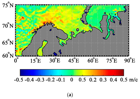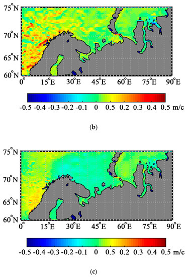 The analysis of currents in the indicated calculation zone has also been performed. Figure 7 shows the results of calculations of the velocity of zonal currents before correction (Figure 7a), after correction (Figure 7b), and the difference between the velocities of currents after and before correction (Figure 7c). We are mostly interested in the zonal component of velocity, since it is known that the main currents pass along the coastal lines of Scandinavia and the Kola Peninsula and are the continuation of the North Atlantic Current.