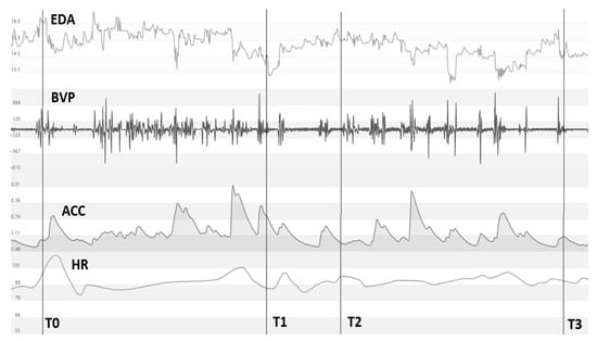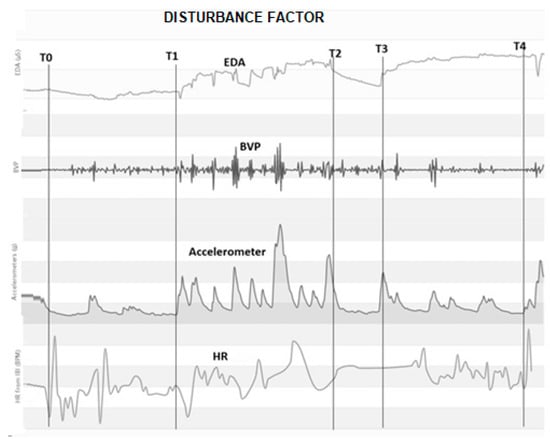 Biometric parameters during disturbance factor. EDA—Electro-Dermal activity, BVP—Blood-Volume pulse, ACC—wrist acceleration, HR—Heart-Rate. T0—beginning of the primary disturbance factor, T1—end of the primary disturbance factor, T2 beginning of the secondary disturbance factor, T3—end of the secondary disturbance factor.